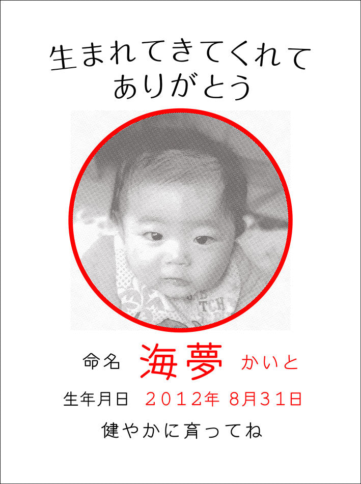 お名前、誕生日、写真は右図に示された箇所に入ります。