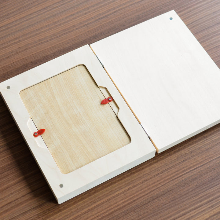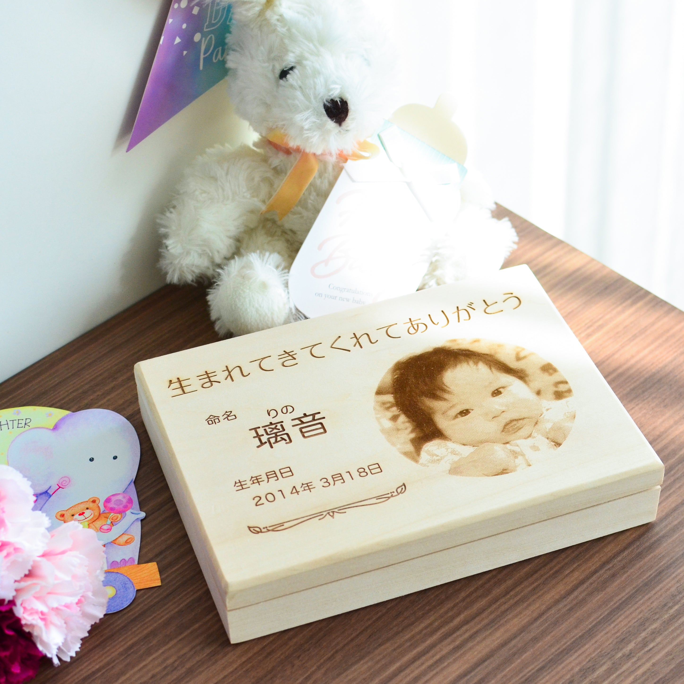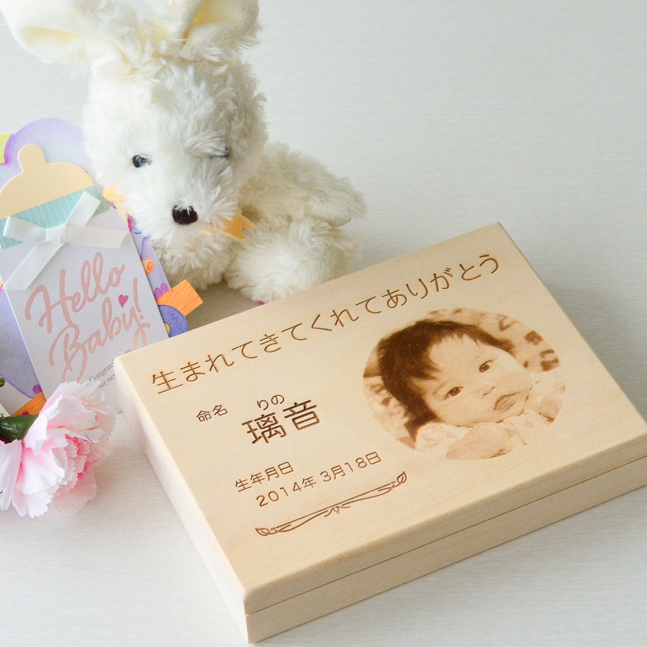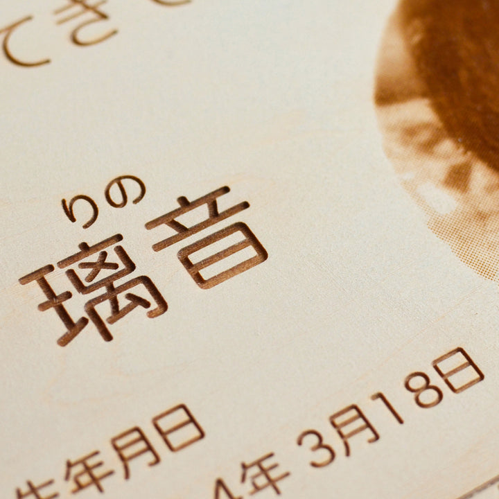 天然木にレーザー刻印を施した、立てて飾れるニューボーンのメモリアルボックスです。