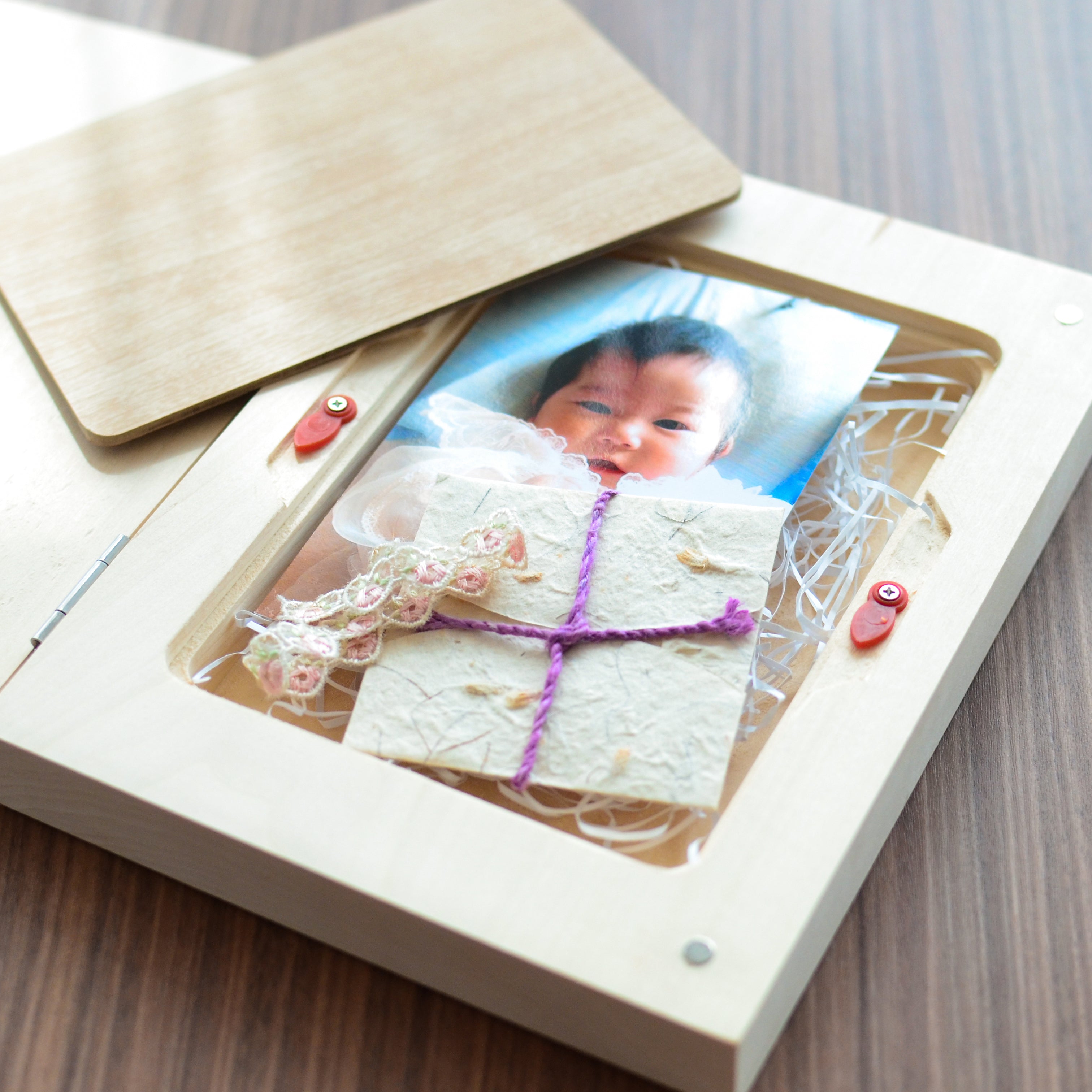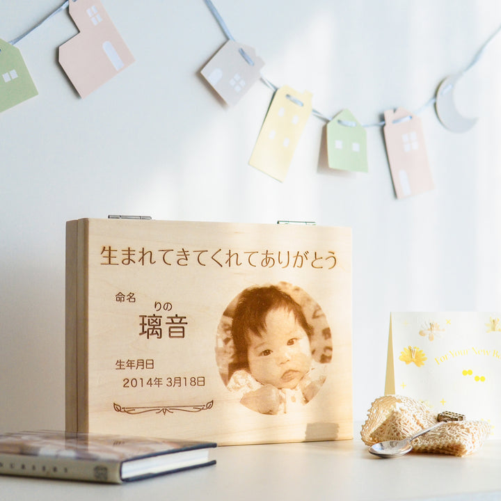しっかり厚みのある外蓋と収納物を保護する内蓋が付いた贅沢な作り。オリジナルでお写真とお名前、生まれた日付をお入れいたします。職人が一つ一つ心を込めて手作りしたナチュラルなボックスは、出産祝いのプレゼントにもぴったり。誕生の思い出とともに、大切な宝物となることでしょう。