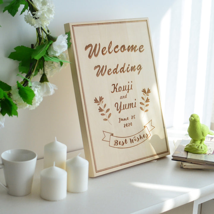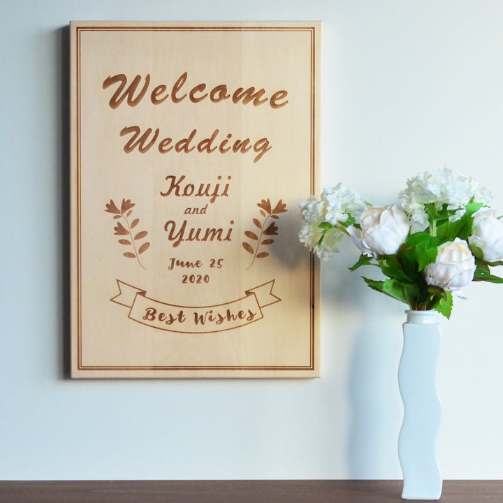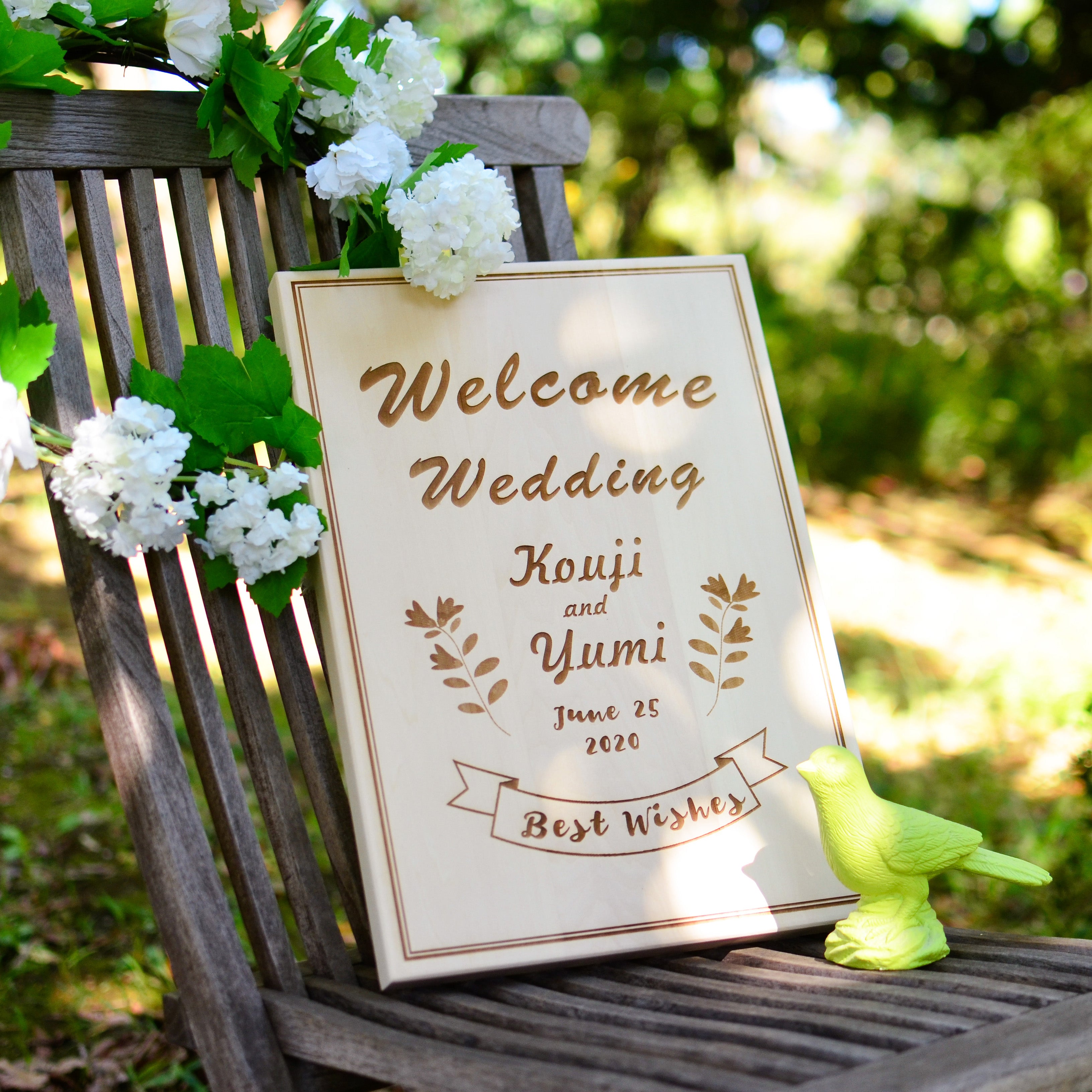職人が一つ一つ心を込めて手作り。オリジナルで新郎新婦のお名前と日付をお入れいたします。A3サイズなので印字の文字サイズも大きく引き立ちます。やさしいデザインのナチュラルなボードは、パーティ会場を素敵に演出。お二人に変わって、お客様を心込めてお迎えします。