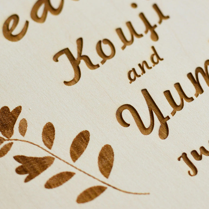 天然木にレーザー刻印を施したウェディングウェルカムボードです。